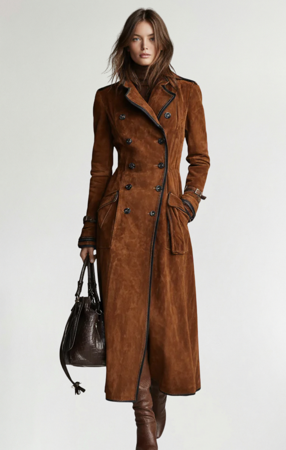 Ponte esta suave y lujosa chaqueta de gamuza vegana, cuyo corte largo se adapta con gracia a tu figura, y siente cómo acentúa tu fuerza y equilibrio naturales sin esfuerzo.