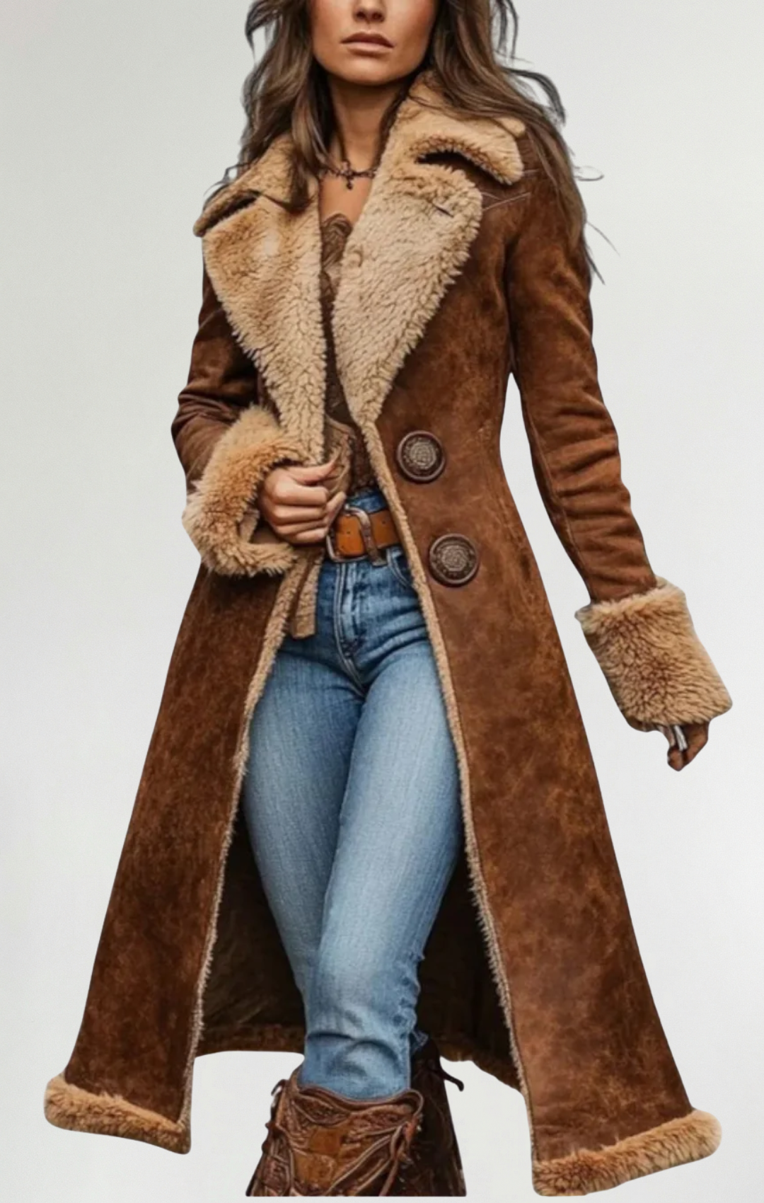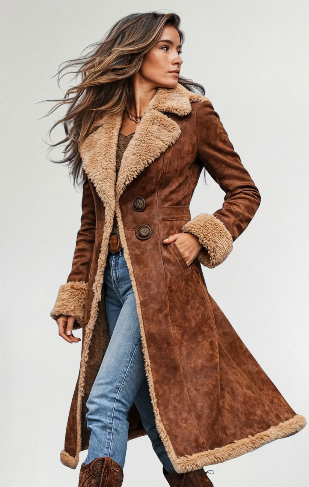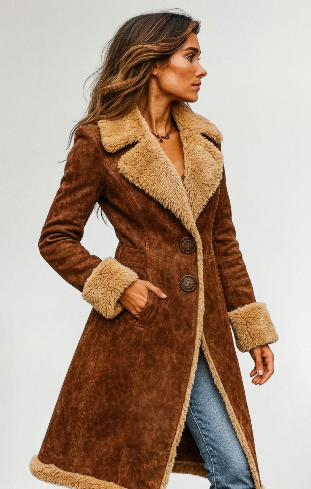 Una oda a la elegancia vintage y la calidez indomable. Este abrigo largo, con un suave forro de piel sintética y ribetes inspirados en el ante, ofrece un equilibrio poético entre refinamiento y comodidad. Su silueta acampanada alarga la figura, mientras que los contrastes de texturas evocan libertad y una feminidad refinada. Una prenda excepcional para transformar cualquier salida en una escapada con elegancia.