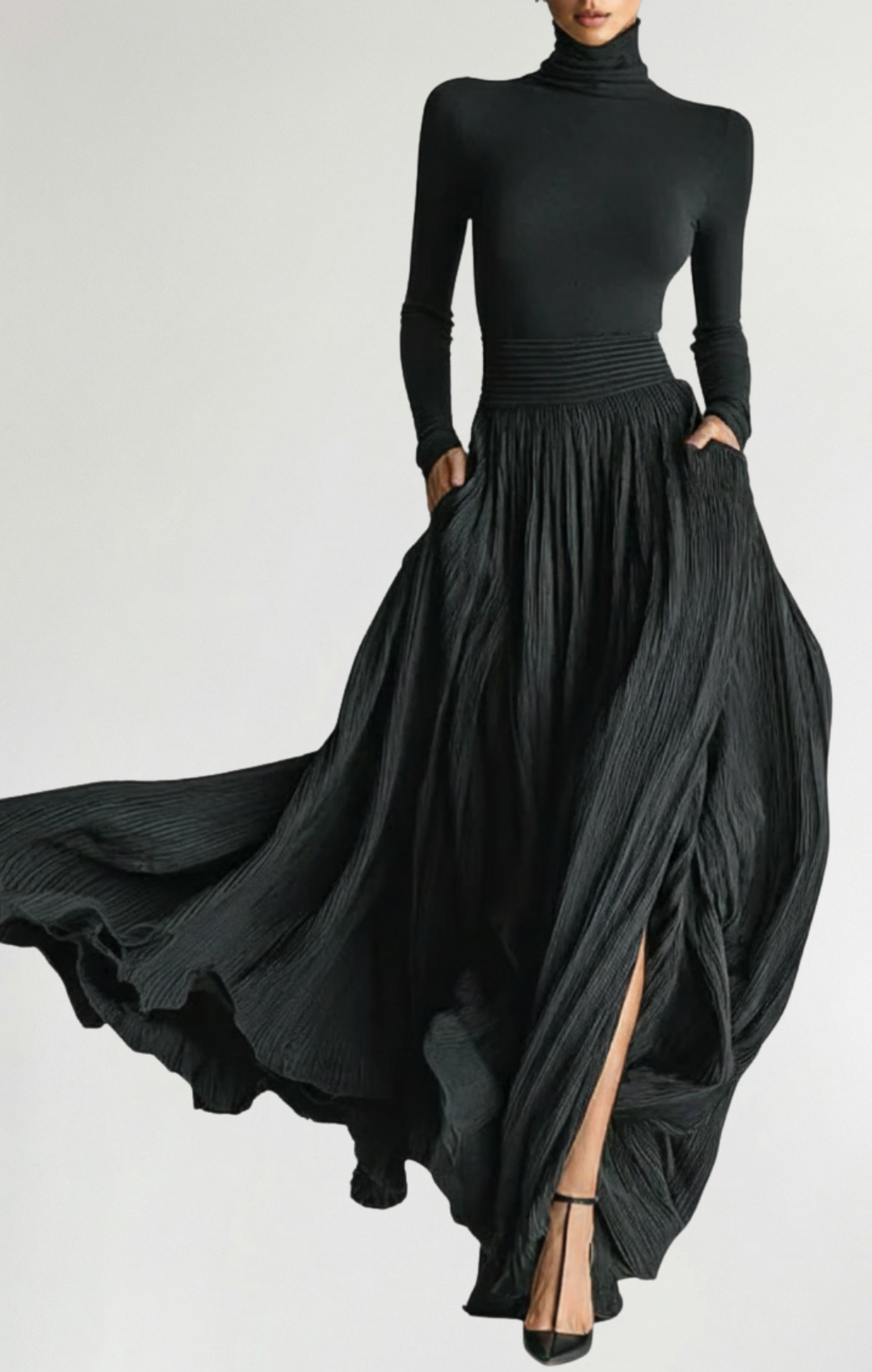 Realza tu estilo con el conjunto de falda plisada negra ajustada y camiseta de manga larga para mujer. Este elegante conjunto combina un cuello alto ajustado con una moderna falda plisada, perfecto para crear un look sofisticado y a la moda.