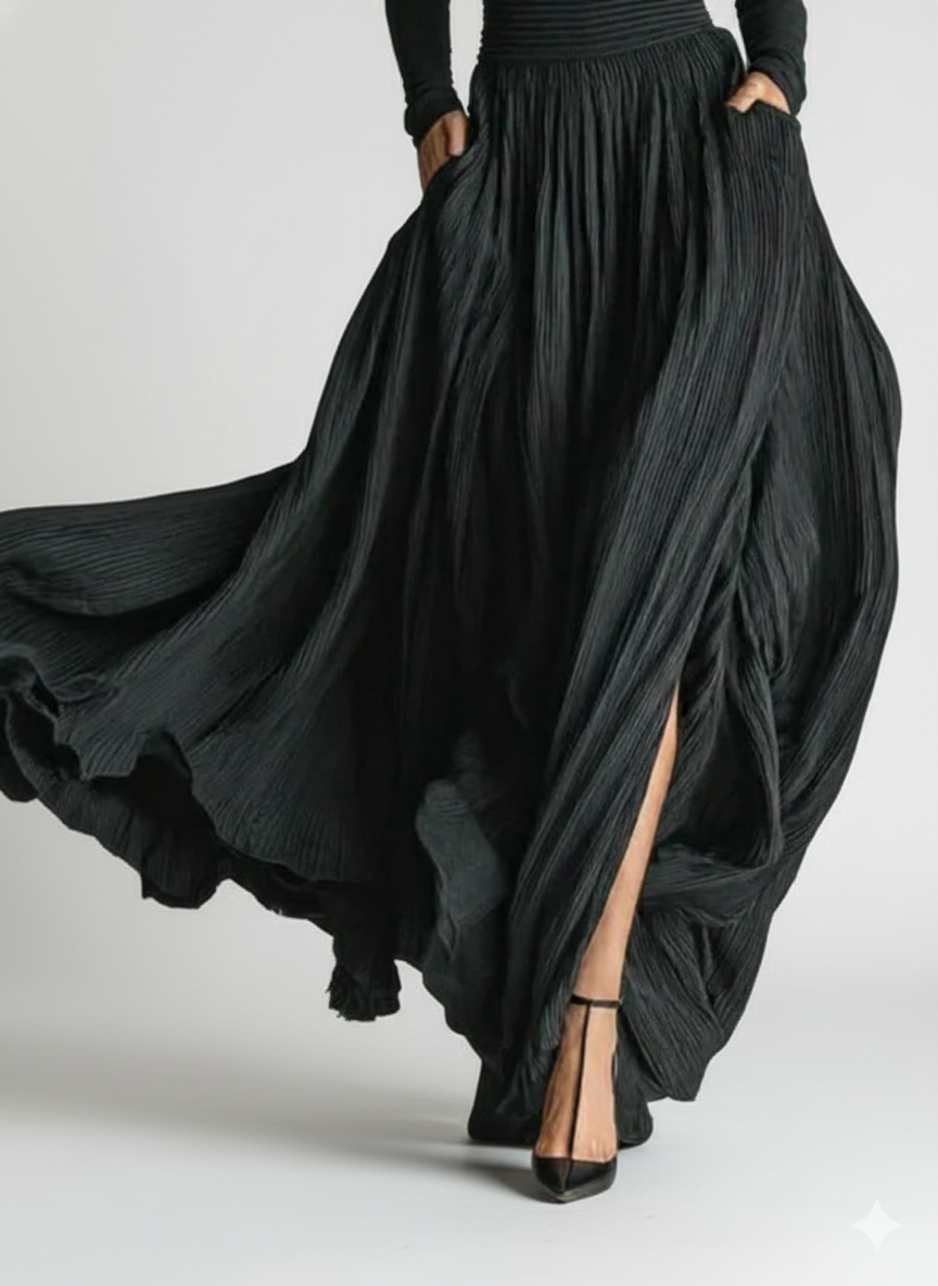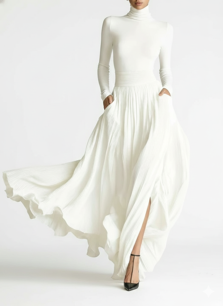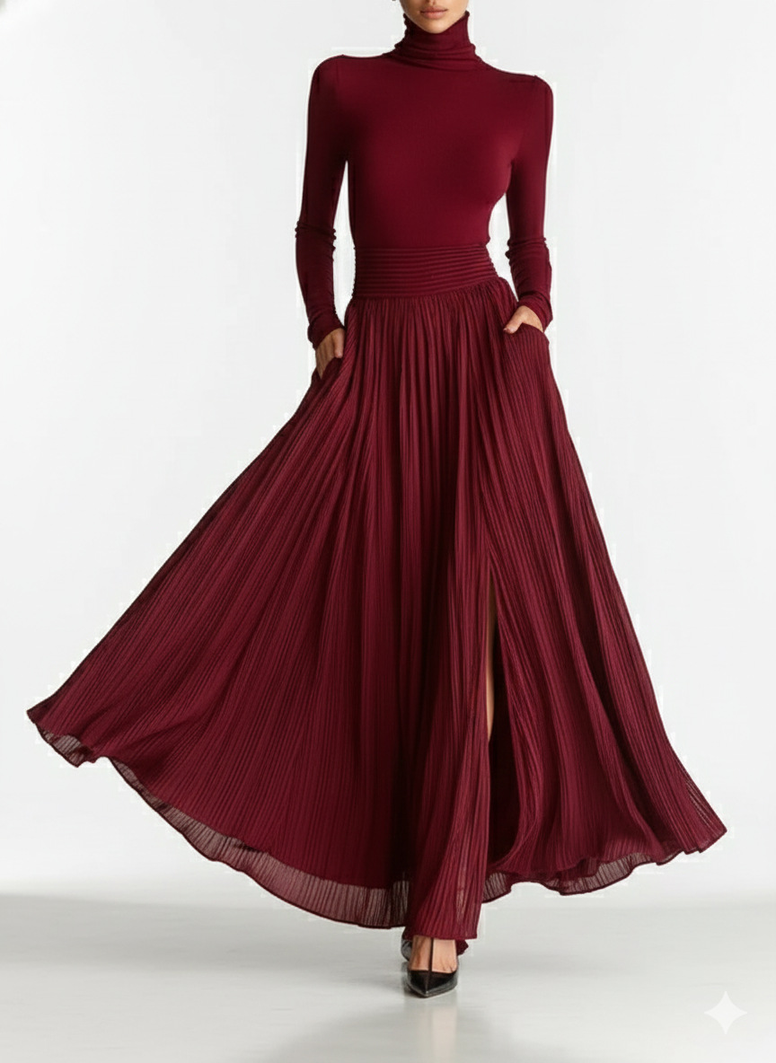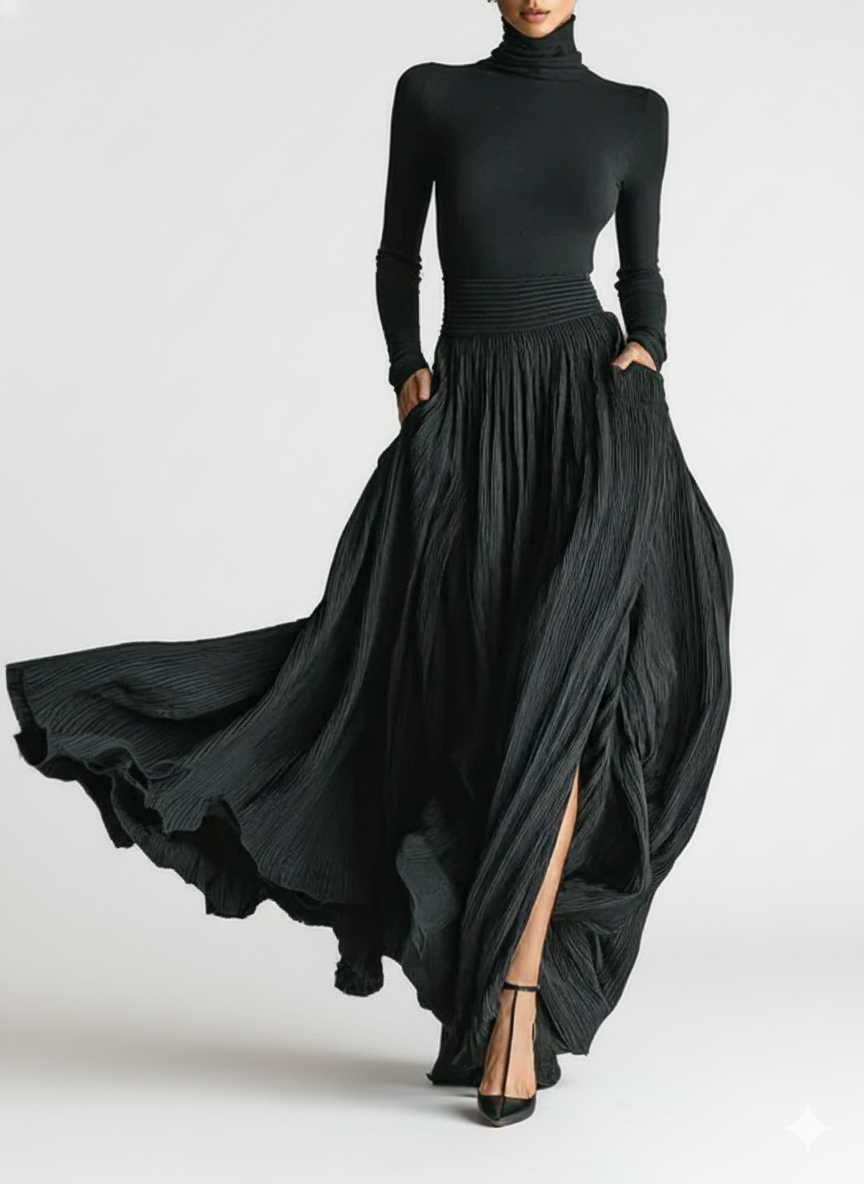 Realza tu estilo con el conjunto de falda plisada negra ajustada y camiseta de manga larga para mujer. Este elegante conjunto combina un cuello alto ajustado con una moderna falda plisada, perfecto para crear un look sofisticado y a la moda.
