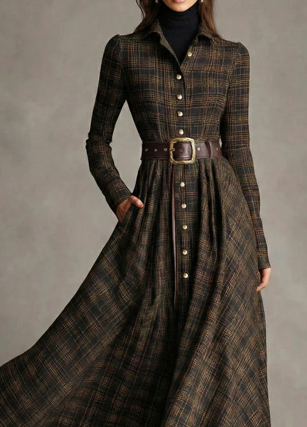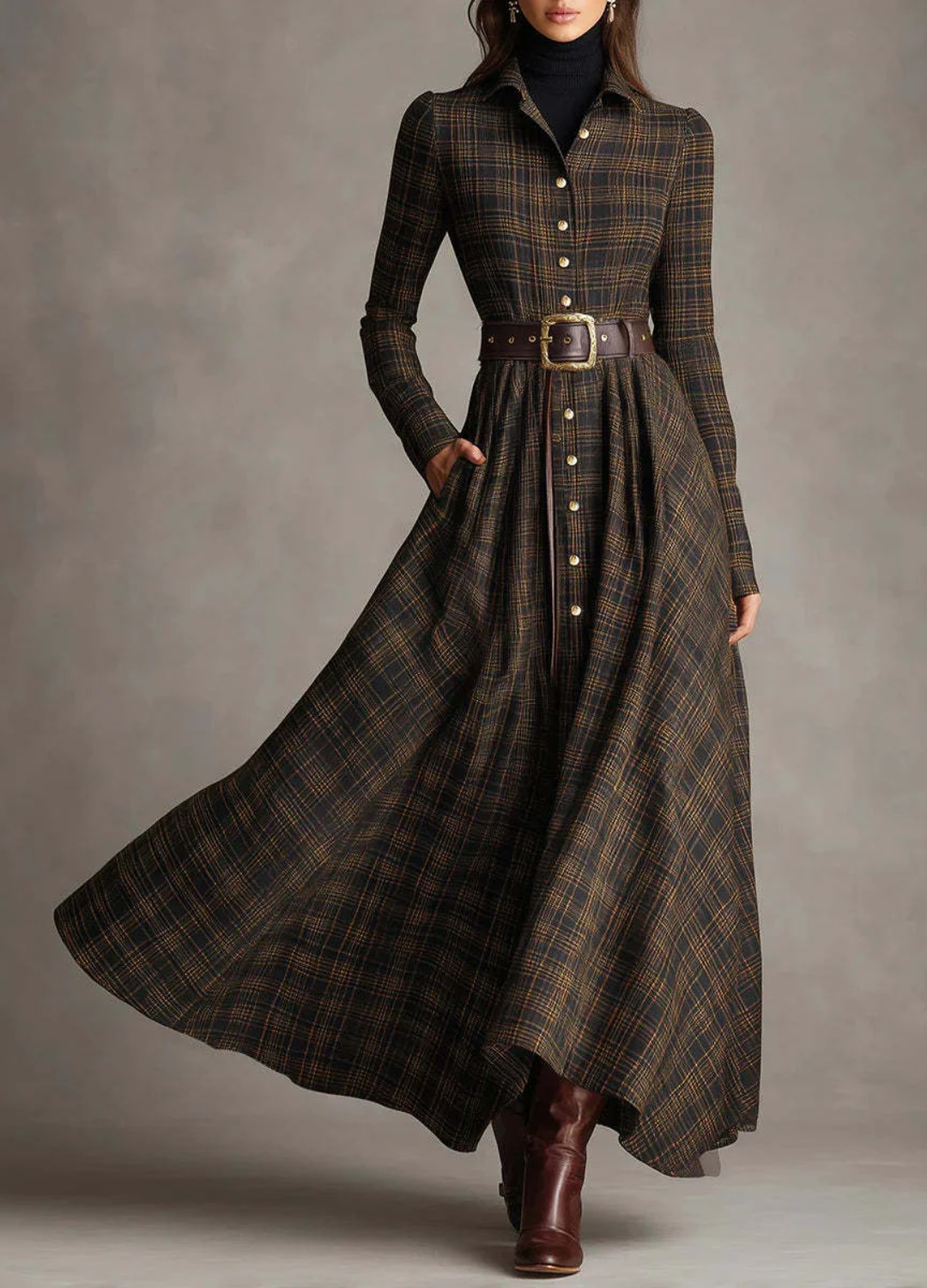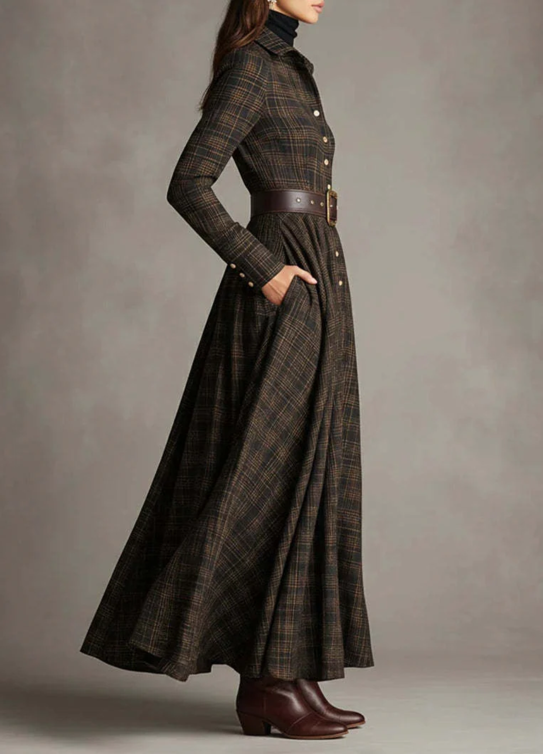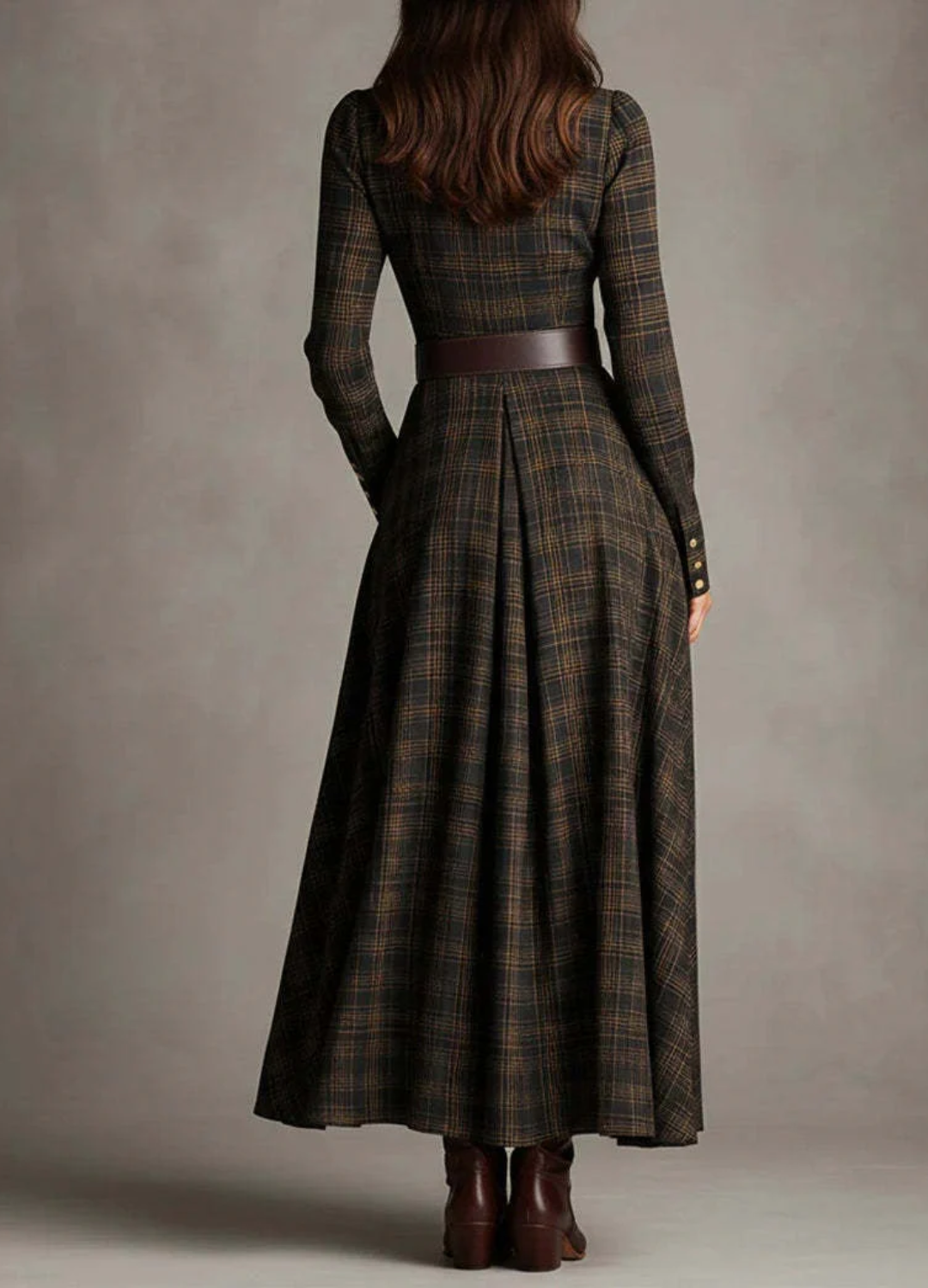 El vestido Sarah™ encarna el encanto de una feminidad atemporal con un toque de sofisticación moderna. Confeccionado en una tela suave y estructurada con un patrón de cuadros fluido, se ciñe con gracia a la cintura gracias a un cinturón original que realza todas las siluetas. Su corte largo y entallado y su botonadura evocan una confianza serena: una mezcla natural de refinamiento clásico y gracia contemporánea.